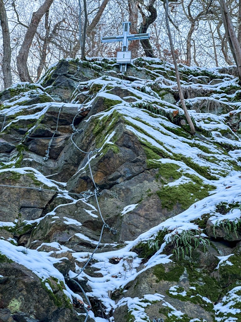 Das scheint einer dieser sogenannten „Klettersteige“ zu sein. Oben ist offenbar an einer aufwändig gestalteten Vorrichtung ein Beschwerde-Briefkasten angebracht („Ihre Meinung ist uns wichtig!“). Sehr kundenfreundlich. Ich habe große Lust bekommen, so etwas auch einmal auszuprobieren.